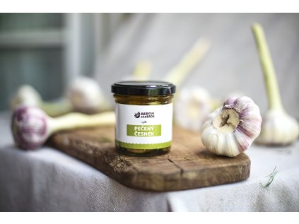 Český česnek pečený v olivovém oleji ve směsi koření, vhodný k okamžité konzumaci.Dokonale vyzrálý český česnek...